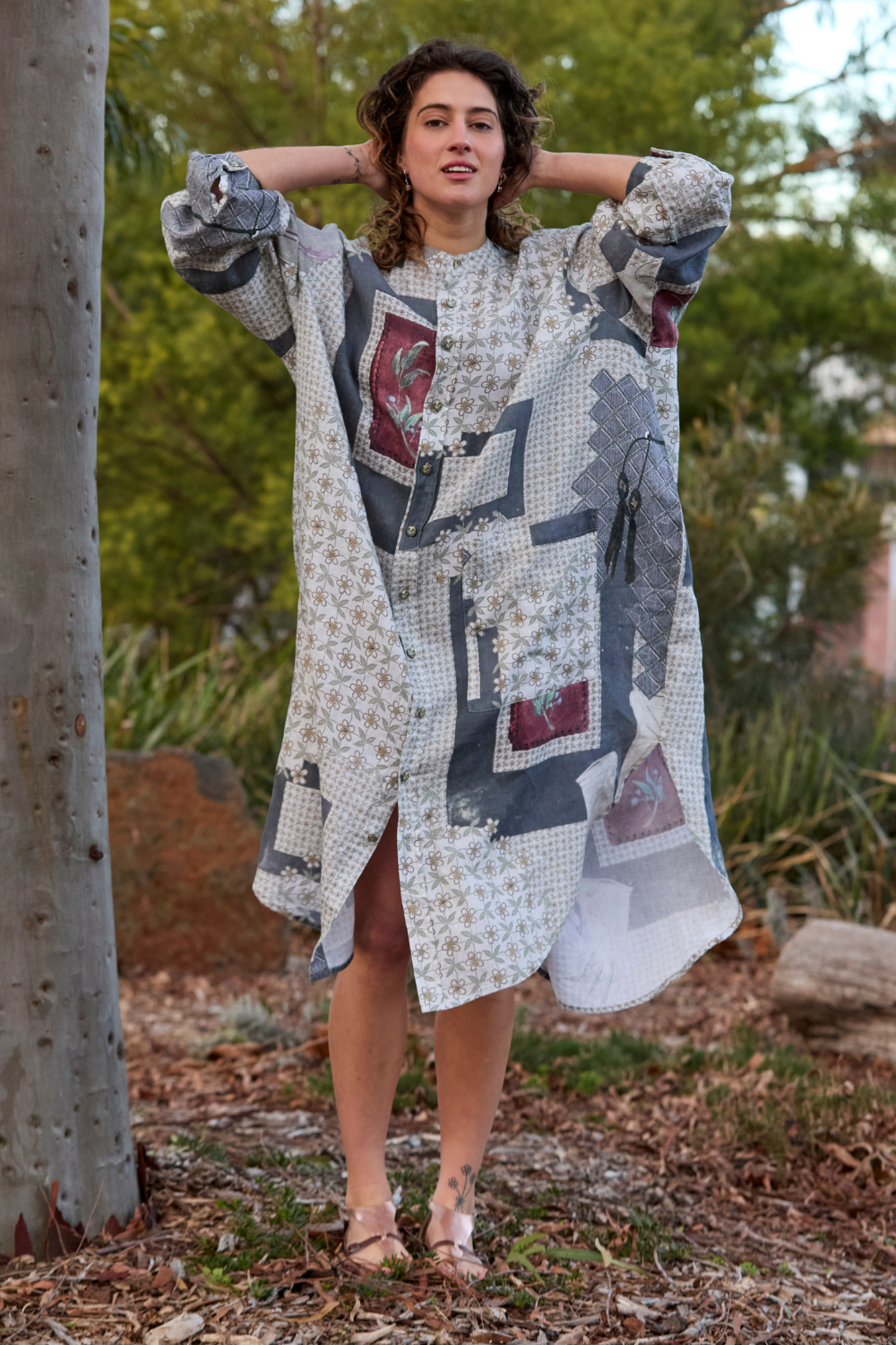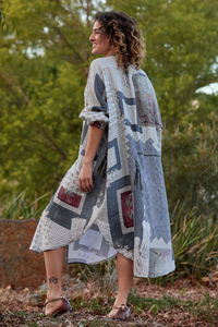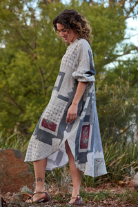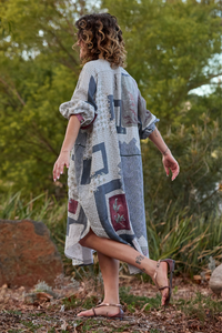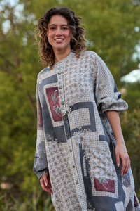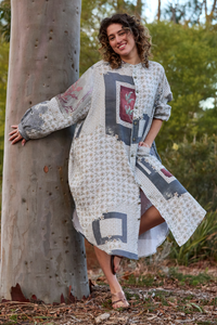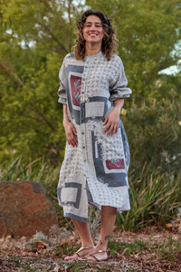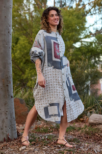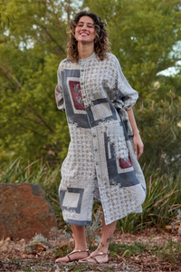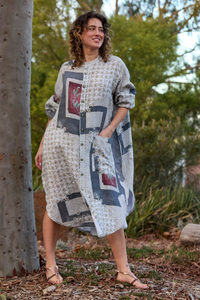 The Prue Shirt Dress by Maud Dainty is a relaxed, oversized style with a statement patchwork-inspired print. Designed with comfort and versatility in mind, this button-through dress features a collar, long sleeves, and handy side pockets. Wear it loose for an effortlessly cool look, or style it belted to create shape and structure. Perfect for layering across seasons.