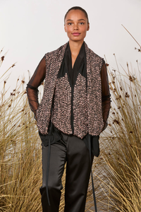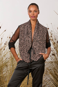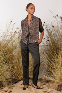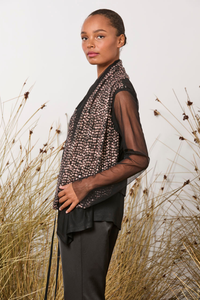 Elevate your wardrobe with the M.A.Dainty Miranda Jacket, crafted from a refined blend of nylon mesh and sequin silk. This lightweight piece balances delicacy and impact, with a shimmering sequin body contrasted by sheer arms. Finished with a tie-front closure and medium length cut, it offers elegance and ease — the perfect layer for evening wear or upscale occasions.