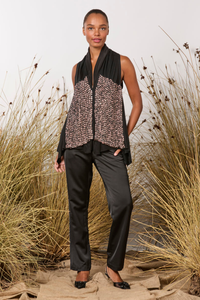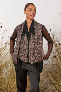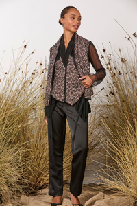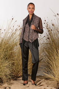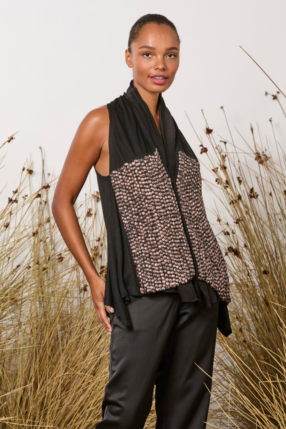 The M.A.Dainty Samantha Vest is crafted from a luxurious silk-viscose jersey blend, offering a smooth, lightweight finish with a subtle sheen. Designed with a refined cut and finished with soft metal sequins and front clasps to wear open or closed, this versatile piece creates a flattering silhouette that works effortlessly for layering or as a standalone statement.