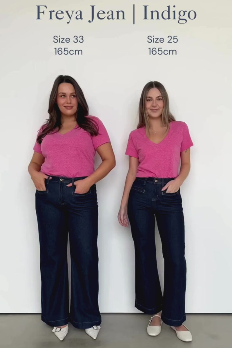 Effortlessly chic and inspired by ’70s style, the Freya Jeans by Kireina are a modern take on the classic wide-leg silhouette. Crafted in soft stretch denim with a dark indigo wash, they feature a mid/high rise, fitted hips, and a relaxed wide leg that flares from the knee for a flattering, easy-going fit. Perfect with a breezy cotton shirt and boots or sandals, these jeans are as versatile as they are stylish.