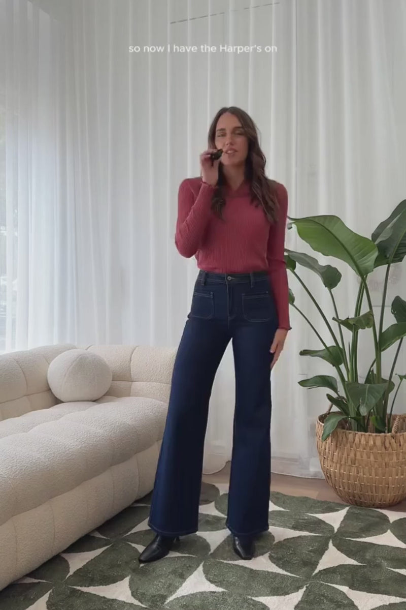 Bold, flattering, and effortlessly stylish, the Harper Jeans by Kireina are a modern take on our favourite ’70s-inspired silhouette. Crafted in signature stretch denim with a dark indigo wash, they feature a high-rise, slim-fitting hip, and gently flared wide leg for a figure-enhancing look. Front and rear patch pockets add functional detail, making these jeans as versatile as they are comfortable.